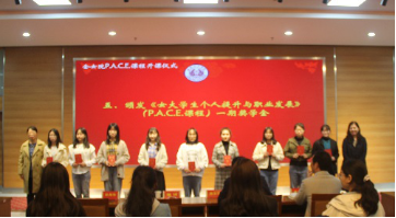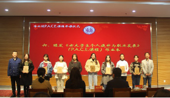 在全场热烈的掌声中,江苏省妇联干部学院院长施斌、学生工作处副处长孙茂华为“贻芳书院”一期优秀学员颁发《女大学生个人提升与职业发展》(P.A.C.E.)课程奖学金,鼓励同学们继续以积极向上的精神风貌迎接未来的生活与学习。接着,教务处副处长徐永辉、校团委副书记李鹏向贻芳书院二期学生代表发放了书院特色P.A.C.E.课程的作业本,期待她们接下来在学习中的优秀表现。