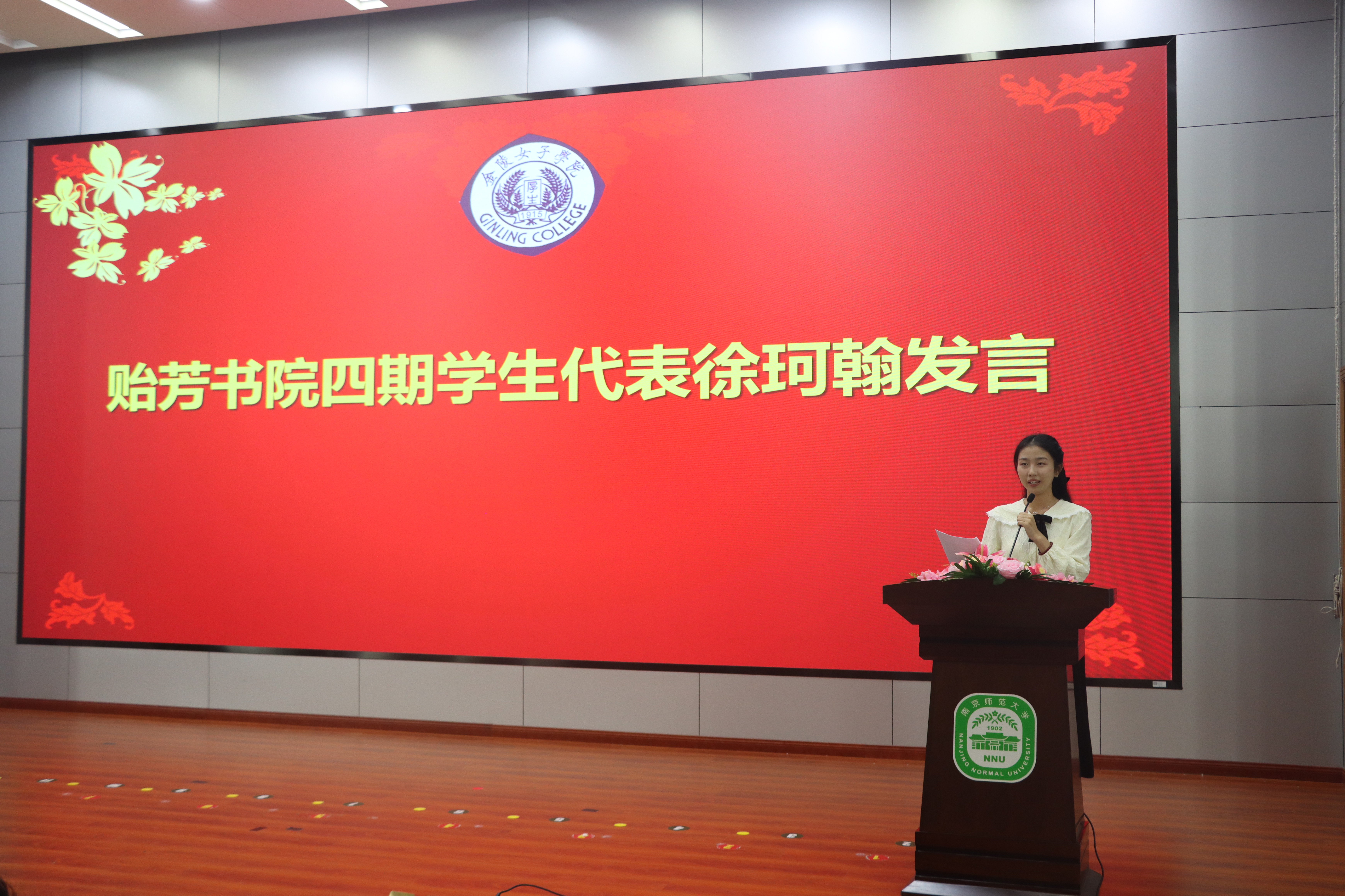 书院二期学员代表姚紫璇、四期学员代表徐珂翰分别发言。姚紫璇同学从贻芳书院对自身的影响谈起,讲述了书院多样化课程带给她的收获,随后深情寄语学弟学妹:希望大家可以秉承厚生校训,传承金女大九百九十九朵玫瑰之风采,向金女大杰出女性们学习,为民族复兴伟业贡献女性力量,展现新时代青年的青春担当。徐珂翰同学则从金女院悠久的院史谈起,她认为贻芳书院是新生与吴校长相遇的最佳形式,并表达了自己对贻芳书院未来教学活动的期待,希望在书院学习过程中能够对当代青年的责任有更加深刻的领悟。