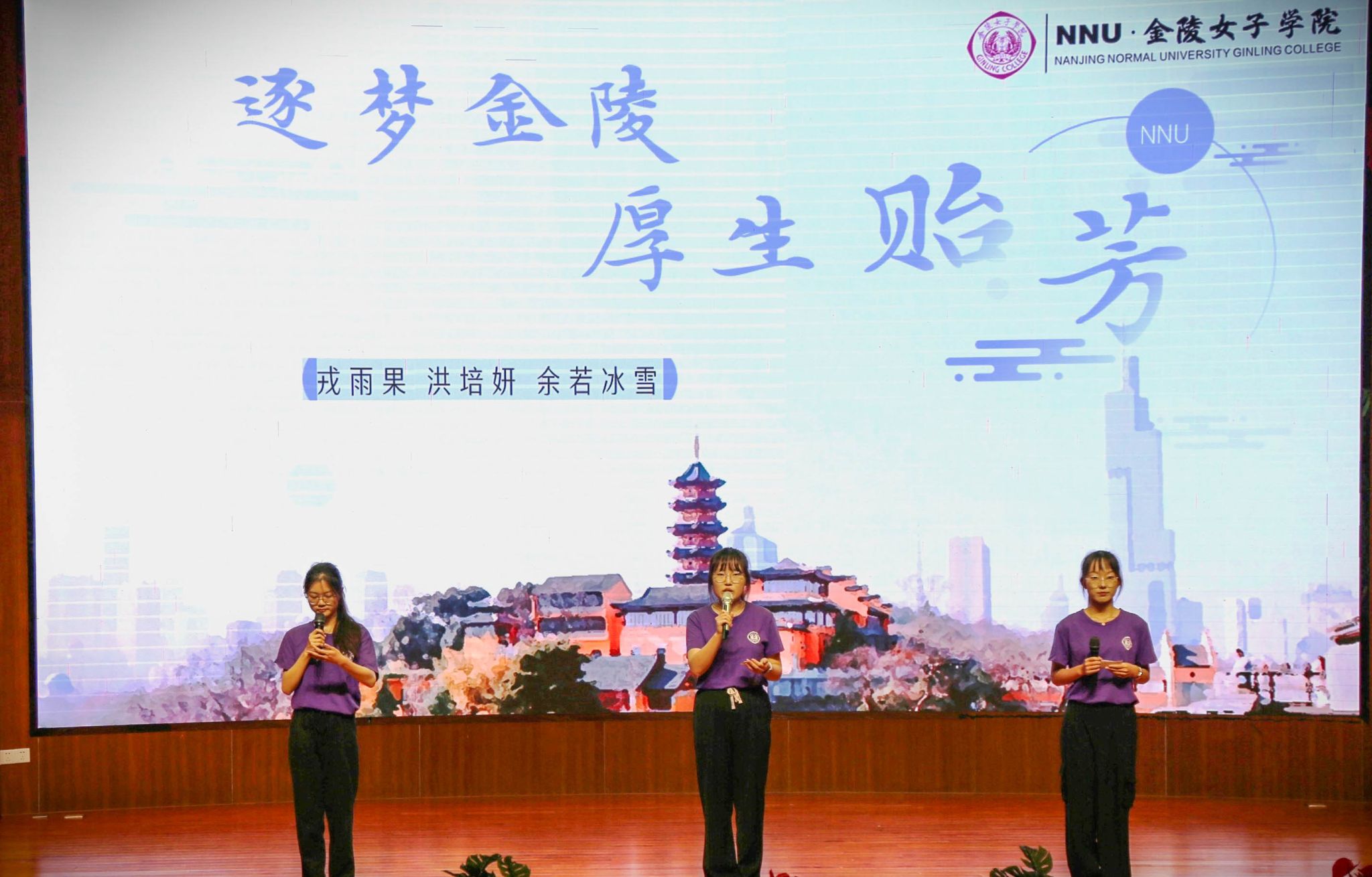 仪式的最后, 2022级会计专业的洪培妍、余若冰雪、戎雨果带来《逐梦金女,厚生贻芳》的主题展示。她们用深情的话语叙述了金陵中学与金女大一脉相承的人文教育理念,讲述了自己在贻芳书院一年来的所思所感,所劳所获。她们用实际行动回眸历史,与百年前金女大优秀的巾帼前辈产生连结,并鼓励在座的学弟学妹们珍惜在书院的时光,彼此学习,共同成长。