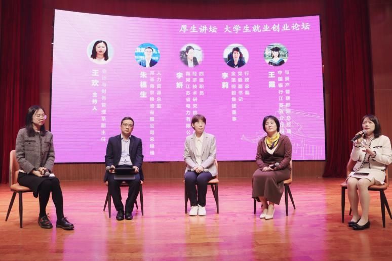 11月3日上午,群芳女生节之大学生就业创业论坛暨厚生讲坛第十三期”在广乐楼音乐厅成功举办。此项活动将学校校友会“最美校友母校行”等品牌活动与学院的校友“厚生讲坛”、群芳女生节之“巾帼标兵走进南师”相融合,邀请了全国五一巾帼标兵、国网江苏省电力有限公司经济技术研究院设计中心四级职员李妍,金箔控股集团董事、党委副书记、行政总裁李莉,中国银行江苏省分行投资银行与资产管理部副总经理王霞,邦基(南京)粮油有限公司总经理、人力资源总监朱福生四位巾帼劳模、女企业家、杰出校友现场分享职业发展经验与个人成长心得,共话促进大学生高质量就业。金女院党委书记薛传会、副书记高见、副院长杨素萍、会计与财务管理系副主任王欢以及金女院、社发院、商学院、公管院、物科院等学院本研学生一同参与。活动由高见主持。