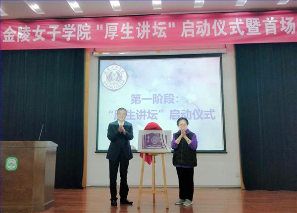 为继承金女大“姐妹班”传统,专门邀请新老校友返校交流、言传身教、助力师生共同成长而设立的学院校友论坛。启动仪式由金女院党委书记薛传会主持。金女院院长赵媛在致辞中对金女大、金女院校友秉承“厚生”精神,爱心助学、无私奉献、服务社会进行了高度评价,并阐述了“厚生”精神的内涵及“厚生讲坛”对于厚生精神传承的重要意义。金女院党委副书记高见宣布“厚生讲坛”海报设计大赛获奖者名单。孙绪敏处长与赵媛院长为获奖同学颁奖并合影留念。李久生副校长与甘克超校友为厚生讲坛揭牌。
