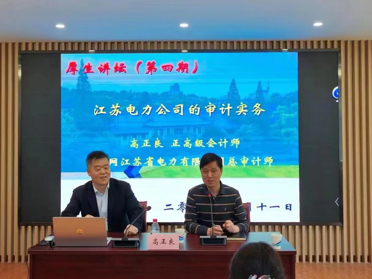第四期“厚生讲坛”在金女院403会议室隆重举行。国网江苏省电力有限公司总审计师兼审计部主任高正良正高级会计师为学院师生带来题为“江苏电力公司的审计实务”的精彩报告,金女院特聘院长杨雄胜教授、会计与财务管理系教师及研究生近百人参加。讲坛由金女院副院长封思贤教授主持。