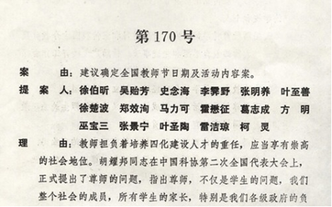 《建议确定全国教师节日期及活动内容案》提案,该提案于2019年入选全国政协成立70年来100件有影响力重要提案