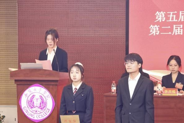 大会在庄严的国歌声中正式拉开帷幕。校学生会主席团成员丁唐婧代表校学生会致辞。她肯定了金女院学生会过去一年在思想引领、服务同学、组织活动等方面取得的工作成绩,并对金女院学生会继续强化服务职能,推动各项工作的进一步发展表示期待,对金女院学生会未来的工作和发展给予了诚挚的祝福。