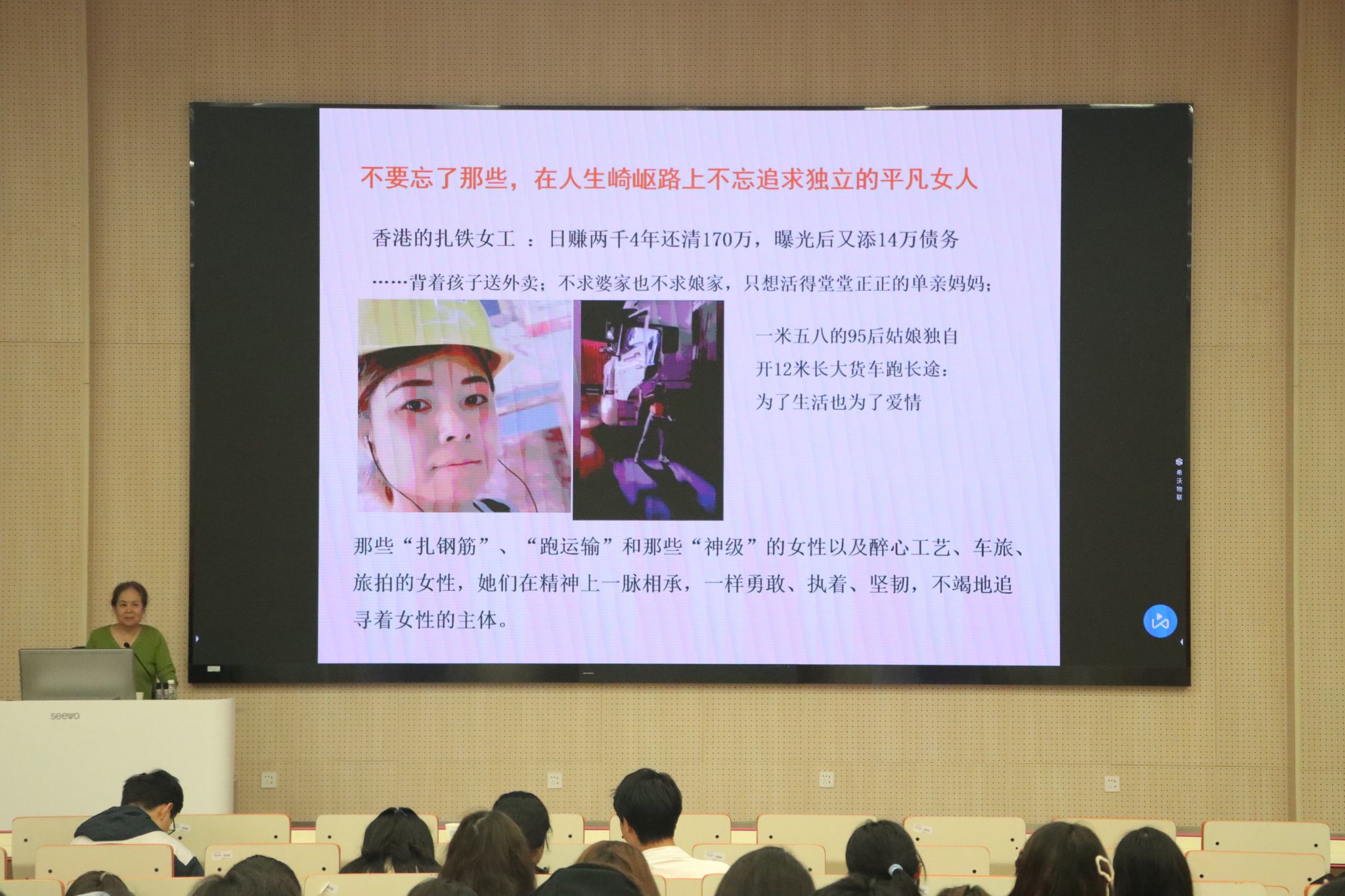金一虹教授强调,不要忘记那些在平凡岗位上奋斗的女性。那些“扎钢筋”、“跑运输”的女性和那些在各个领域取得杰出成就的女性在精神上一脉相承,一样勇敢、执着、坚韧,一样不竭地追寻着女性的主体地位。