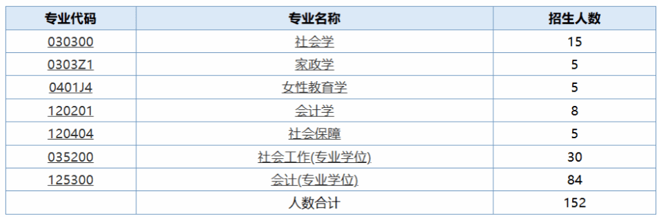 学院现设有社会学一级学科硕士学位授权点、 “会计学”、“社会保障”、“女性教育学”、“家政学”等二级学科硕士学位授权点以及会计专业硕士学位(MPAcc)授权点、社会工作专业硕士学位授权点。学院现有“财政学”二级学科博士点(和商学院合作)和“社会工作”二级学科博士点(和心理学院合作)。