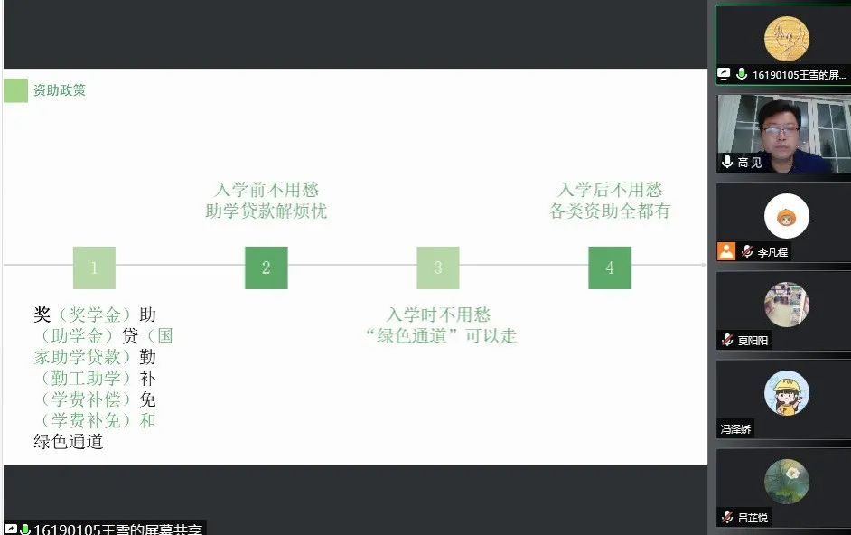 赵妍老师就目前学校建立的“奖、助、贷、勤、补、免”和绿色通道多元混合系列助学措施和学校整体资助工作做了详细解读,让家庭经济困难学生做到入学前、入学中、入学后“三不愁”。她还介绍了20余项院设奖助学金的来源以及评定条件,激励同学们勤奋学习、努力进取,常怀感恩之心,为社会创造更大的价值。
