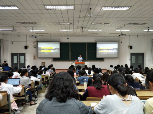 随后,张天野老师进行宣讲。他用幽默的语言向大家详细地介绍了托福考试和GRE,并为同学们学习英语提供了一系列切实可行的建议,他指出同学们要勇于尝试不同的事物,合理规划自己的生活学习,在同学们之中引起强烈反响。
