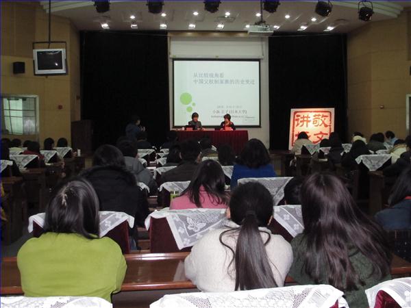 金一虹教授主持,为大家介绍小浜正子教授一直以来倾心研究中国历史,特别是中国性别史,出版了许多相关专著,在中外比较研究上卓有建树。小浜正子教授坚持用中文向大家讲授,她首先运用独特的视角,分析透视了中国传统家族的结构。从社会学角度来看,传统中国是父权制国家即由年长的男性来统治家族;从社会性别学角度来看,则是男权制社会。在这两点上中日两国是相似的,然而中日两国对于“家”存在截然不同的解读,传统的中国家族是长期不变的、具有独特原则的结构,具有强烈的父系血缘主义,“姓”是父系血统认同的核心,永生不变。日本的“家”则是有家业、家名的经营体,具有双系血统观念,姓则随着结婚、收为养子而变化。两国之间对孙辈的称呼,继承财产的原则等方面也因此有所不同。