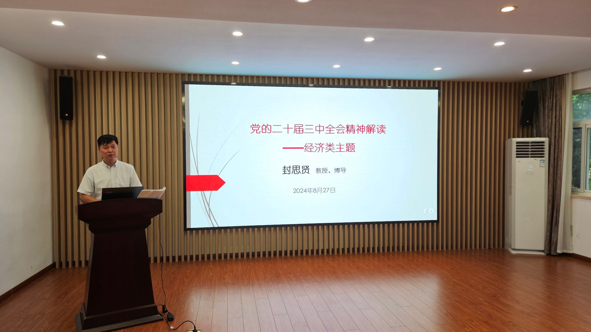 学习研讨会共分两个阶段。第一阶段,学院副院长封思贤教授结合金女院自身学科专业的现状作了题为“党的二十届三中全会精神解读——经济类主题”的专题学习辅导报告。