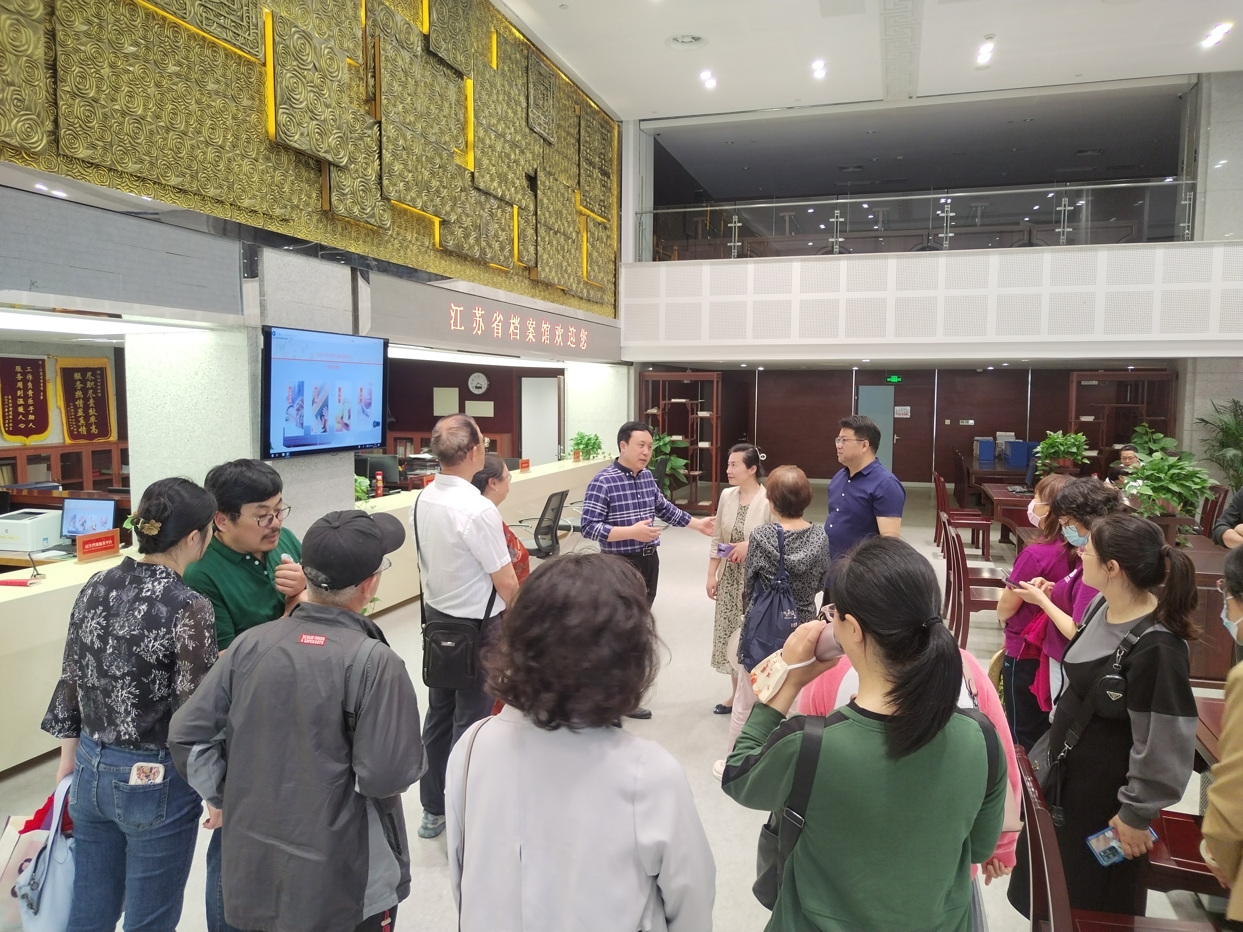 新建的江苏档案馆宏伟气派,根据档案的保密级别又分为很多不同的场馆。在党史展览馆,解说员结合展品详细解说新民主主义革命时期中国共产党艰难而又光辉的奋斗历程。众多珍贵的档案,如毛泽东主席《七律•人民解放军占领南京》的书法手稿,渡江战役的手绘地图等让老师们更真切地感受到南京这座具有光荣革命传统的英雄城市在党史上的重要地位。在精品档案馆,真品档案让人目不暇接。世博会江苏馆的“金木水火土”、 解放战争时期地下工作者代号501同志的鸡毛信等珍贵展品都让老师们大开眼界。最让老师们激动的是在“吴贻芳人物档案”的展柜,大家看到了许多珍贵史料的原件。在话剧《吴贻芳》中扮演中青年吴贻芳和老年吴贻芳的两位老师激动地在展柜前合影。最后老师们来到现代化的查档大厅。普通市民只要提前预约,就可以凭身份证查阅档案。教师们现场体验了电子查档的便捷,在江苏档案馆铺展开来长达18公里的档案海洋里搜索档案,变得轻而易举了。