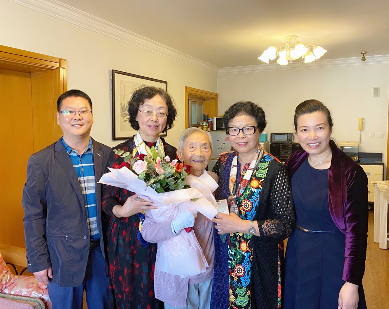 2020年10月11日,秋高气爽的周末,金女院党委书记、金女大南京校友会会长薛传会、金女院赵媛院长、杨素萍副院长、吴贻芳研究中心主任钱焕琦教授专程从南京赴上海,带着鲜花和生日蛋糕,看望拜访金女大百岁校友王明霞前辈。