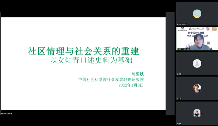 2023年1月8日,由黄色视频 、南京大学当代中国研究院、中华黄色视频 与《妇女研究论丛》编辑部共同主办的“新中国女性群像:口述历史与集体记忆”工作坊在线上顺利举行。