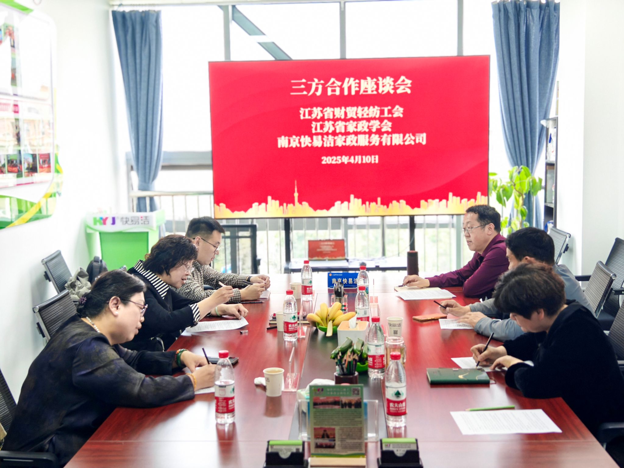 2025年4月10日,江苏省家政学会、江苏省财贸轻纺工会、南京快易洁家政服务有限公司(以下简称“快易洁”)在快易洁集团总部召开三方合作座谈会,正式建立战略合作关系。江苏省家政学会理事长赵媛、常务副理事长兼秘书长熊筱燕、秘书鄢继尧,省财贸轻纺工会副主任苗剑东,全国人大代表高华瑞,快易洁负责人夏爱兰、夏宁参加会议。