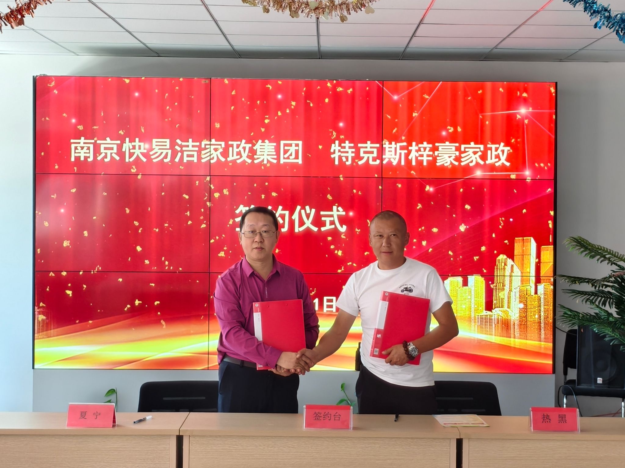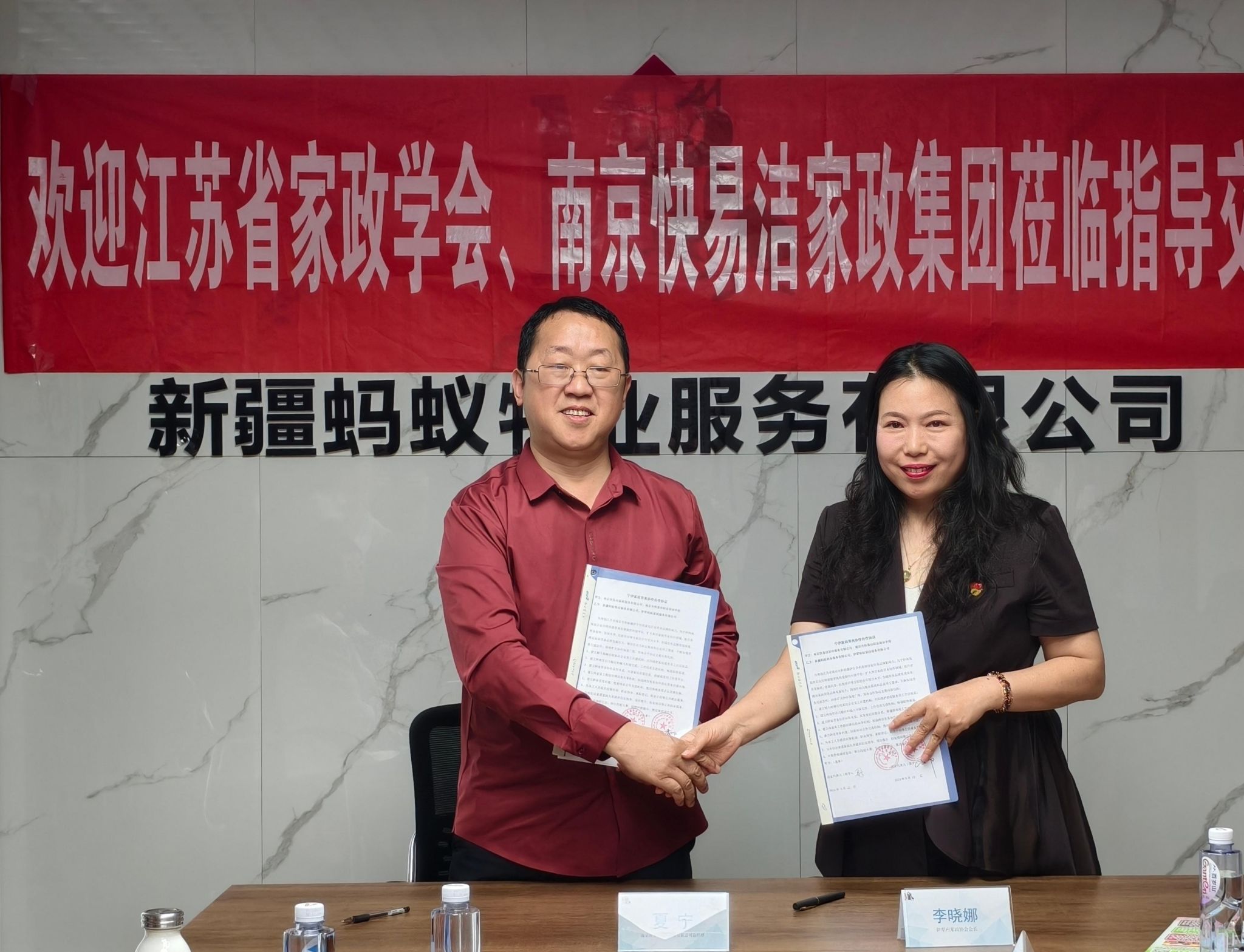 江苏省家政学会理事长赵媛与伊犁州家政服务业协会会长李晓娜签订了《江苏·伊犁家政服务业高质量发展合作协议》,南京快易洁家政集团总经理夏宁和新疆伊犁蚂蚁家政服务有限公司总经理李晓娜签订了《宁伊家政劳务合作协议》。