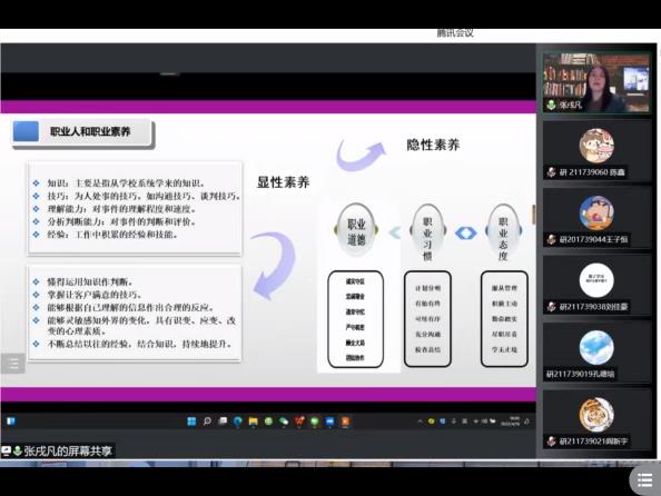 首先,张戌凡教授对职业人与职业化的概念进行了详细的阐述,从知识、技巧、理解能力、分析判断能力与经验能力这五个角度分析了显性职业素养,又从职业态度、职业习惯以及职业道德的角度分析了隐性职业素养。紧接着,她又对研究生需要培养的学术能力进行了分析,并对学术能力的培养方式给出了建议。张老师提到,对于学术工作而言,需要同学们掌握信息搜索能力、信息整合能力以及信息输出能力,而这些能力也同样是职场所需要的。