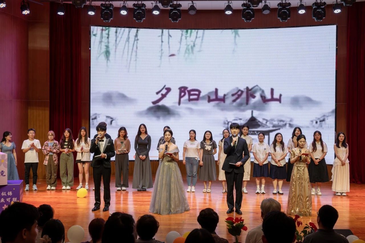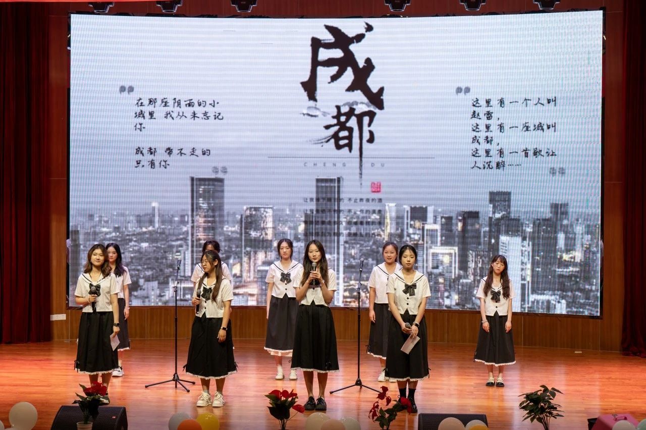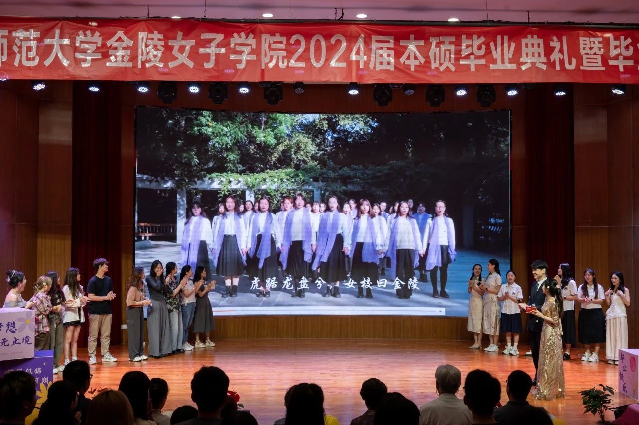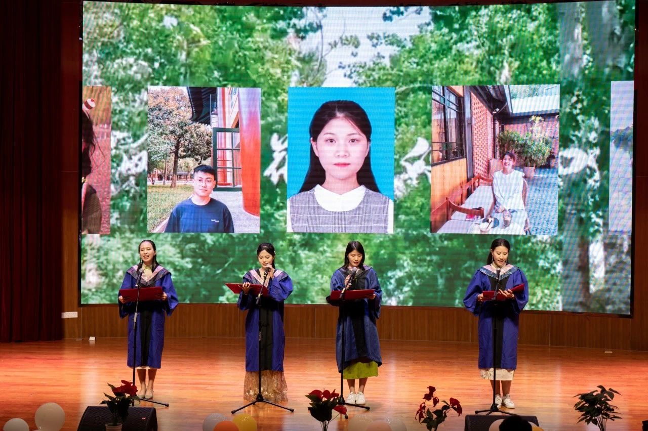开场曲《不为谁而做的歌》的旋律悠扬而起,歌声满载着同学们对校园时光的眷恋和对未来美好生活的向往,在这浩瀚的人海中,我们何其幸运能遇见彼此,相知相惜;接着,21级会计学硕班带来朗诵《梦起师大,情系金陵》,她们回顾了在南师生活学习的点滴,表达了金女的依依惜别和对未来的展望;2005班带来合唱《你曾是少年》,歌词轻吟着往昔四年的美好,那些花儿与笑语交织的时光,仿佛绘成了少年们如花般绚烂的青春,愿他们未来的道路,亦如这花儿一般,绽放出耀眼的光彩,前程似锦,明媚如春。