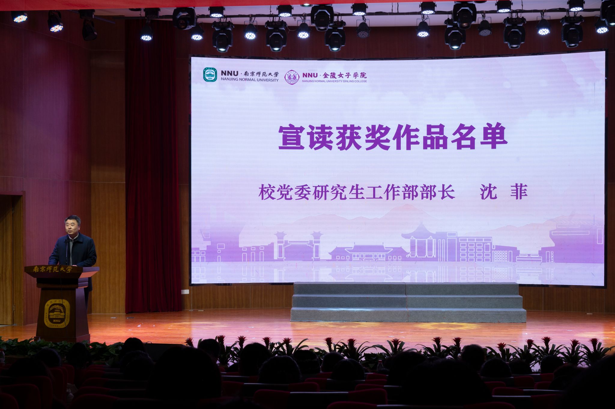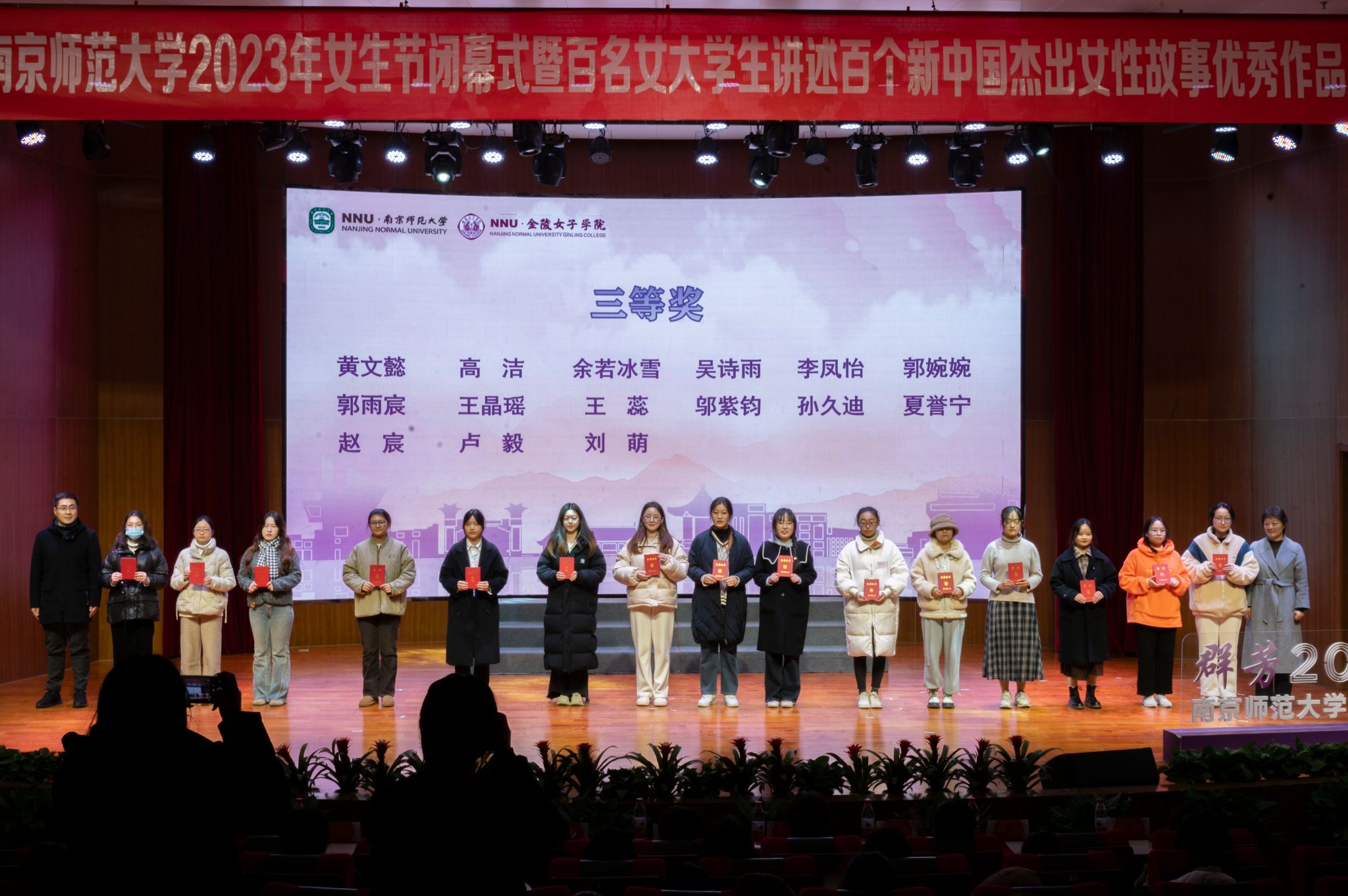 校党委研究生工作部部长沈菲宣读获奖名单,2023校女生节专项——“百名女大学生讲述百个新中国杰出女性故事”活动,共收到来自27个学院的210份参赛作品,最终评选出获奖作品60个,其中一等奖10位,二等奖20位,三等奖30位。他指出,此次活动受到了同学们的热烈欢迎,每一份投稿作品都饱含着南师学子对新中国杰出女性事迹的深刻理解与独特诠释。他鼓励广大同学继续踔厉奋发、笃行不怠,学习杰出女性事迹、展现南师学子作为。