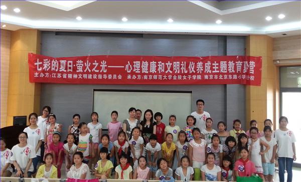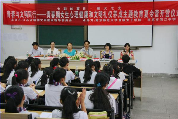 副院长熊筱燕、党委副书记杨素萍、团委副书记丁浩带领学院10余名大学生志愿者来到南京市滨江中学,在此隆重举办2014年萤火之光·青春与文明同行——青春期流动留守女童心理健康和文明礼仪养成主题教育夏令营开营仪式。南京市滨江中学张殿录副校长、德育处吴洪武副主任等领导以及滨江中学100余名初一初二女生共同参与了本次活动。